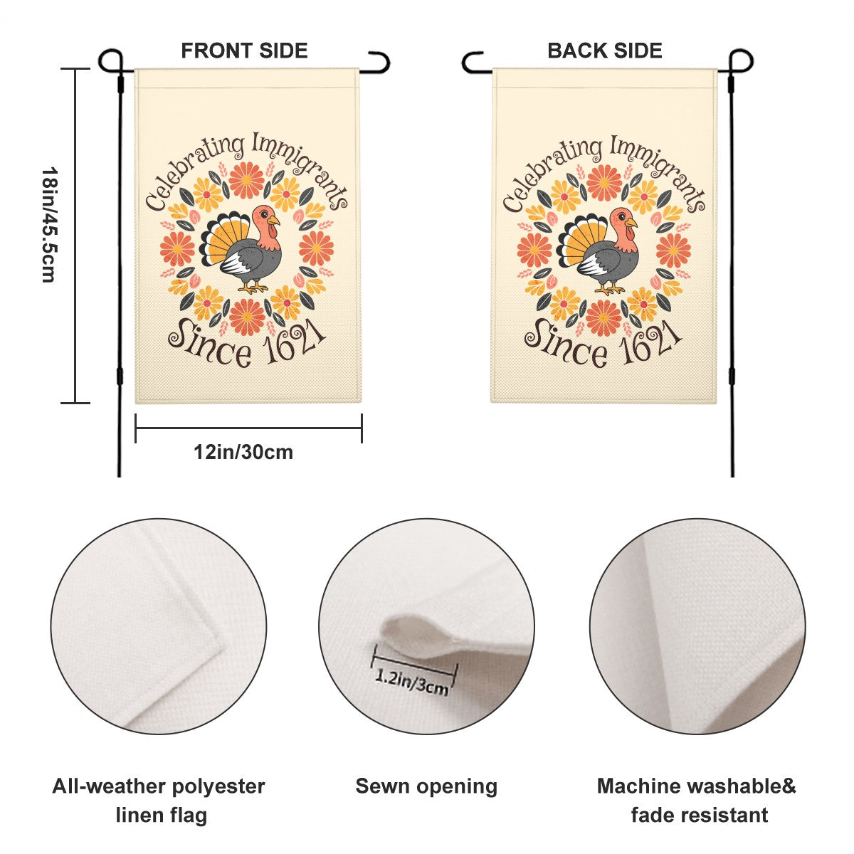 Give your yard a vintage harvest glow. This double-sided floral turkey flag blends retro charm with autumn warmth, making it the perfect statement piece for Thanksgiving season.